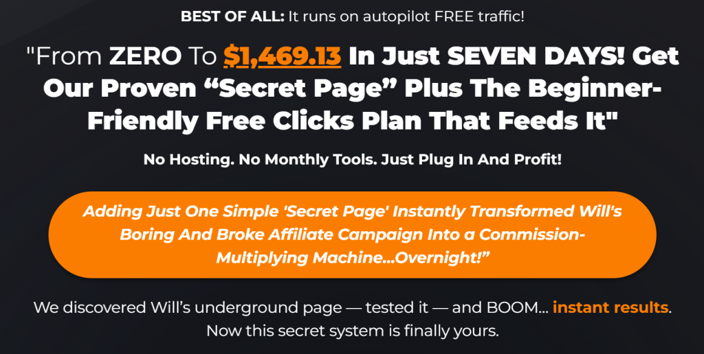 At its core, The Secret Page uses a “copy-and-paste secret page system” that connects your affiliate offer to a powerful free traffic source.