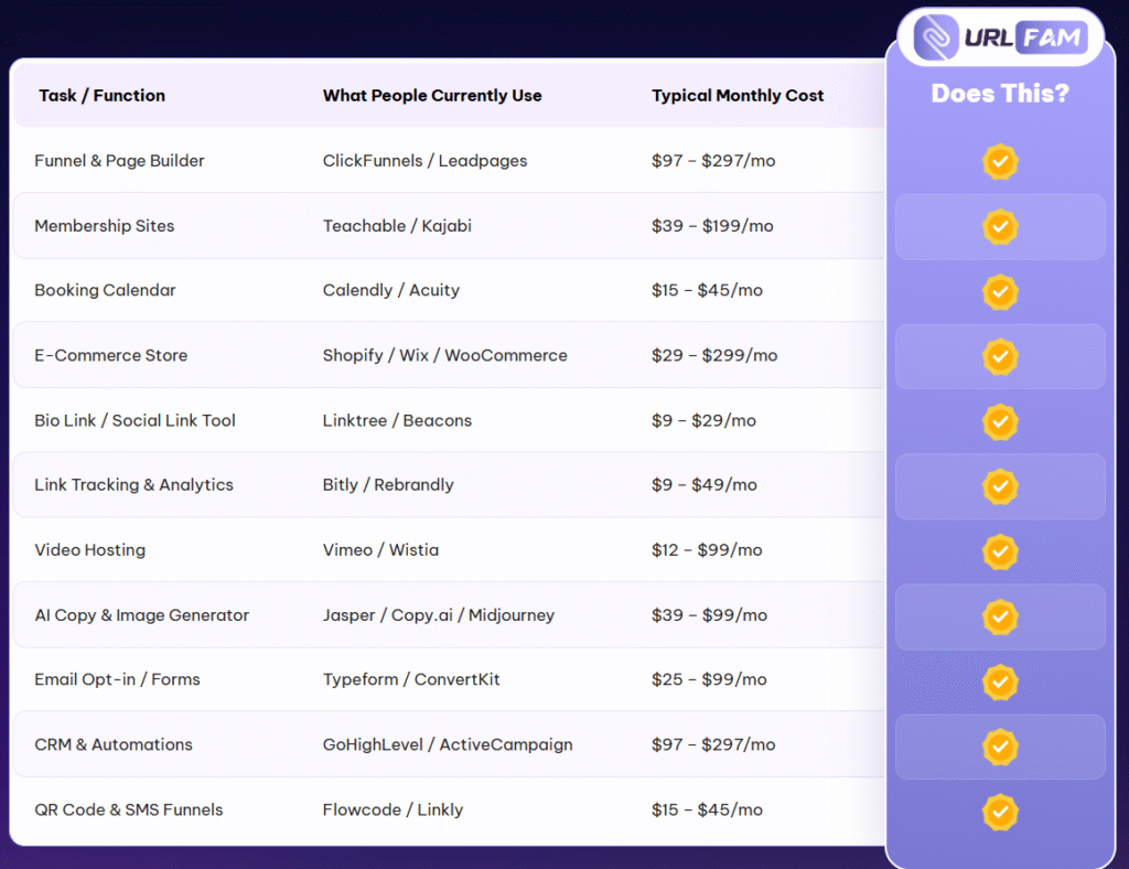| Feature | URLFAM | ClickFunnels | Leadpages | LinkTree | GrooveFunnels |