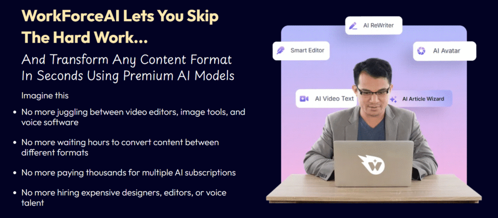 WorkForce AI is a multi-AI business automation platform designed to create, publish, and monetize content across different media formats — text, video, images, and audio — from simple prompts.