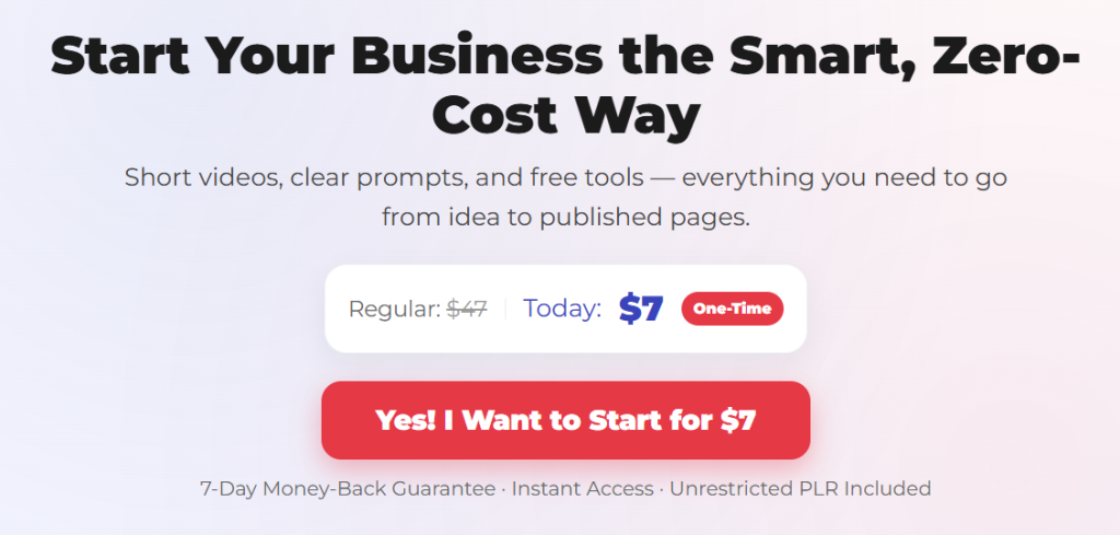 A complete business model + PLR license + free tool training — all for $7 one-time.